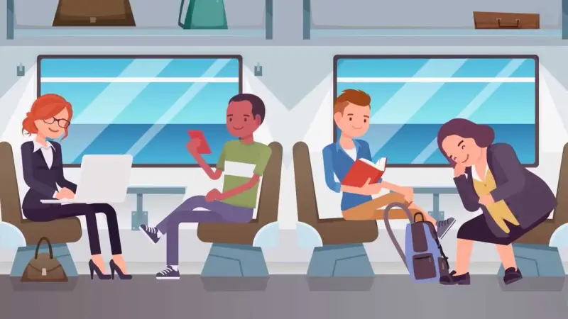 На рисунке изображены четыре человека, которые находятся в поезде, и каждый занимается чем-то своим.