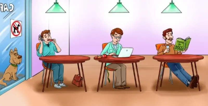 Правильный ответ: владелец собаки сидит за вторым столиком. На его стуле можно заметить поводок зеленого цвета, а у собаки ошейник такого же цвета.