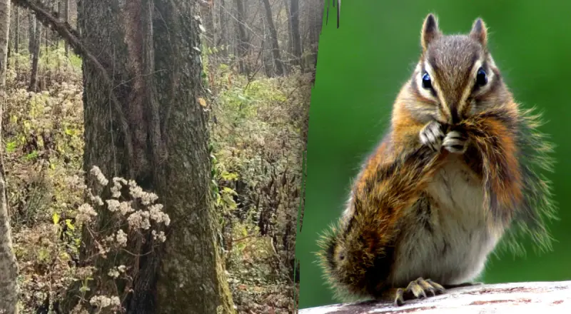 На картинке мы видим дерево, которое растет посреди леса. На первый взгляд кажется, что больше ничего, кроме изображения этой лесной идиллии, мы не увидим. Но это не так. Где-то на картинке спрятался хитрый бурундук, заметить которого будет очень сложно.