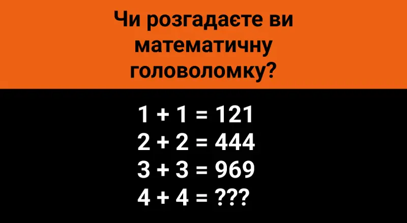 Нужно за 10 секунд догадаться, что будет после равно в примере 4 + 4 = ???, учитывая все предыдущие примеры.