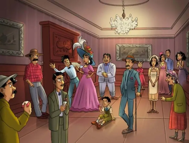 На первый взгляд, на представленной картинке собрались люди из прошлого. Люди, одетые в винтажные наряды, общаются, а комната хорошо освещена люстрой над головой.