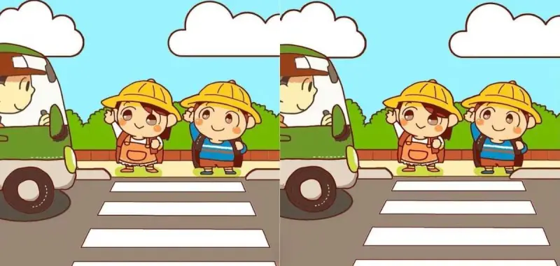В следующей загадке нужно отыскать три различия между картинками, на которых изображены двое школьников, стоящих у пешеходного перехода и смотрящих на проезжающий автомобиль.