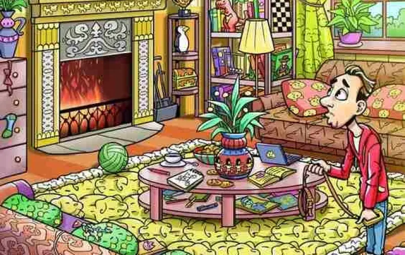 В комнате, где спряталась желтая собака, есть очень много вещей, которые будут отвлекать ваше внимание. Но не стоит поддаваться на отвлекающие факторы - пусть они не сбивают вас с правильного пути.