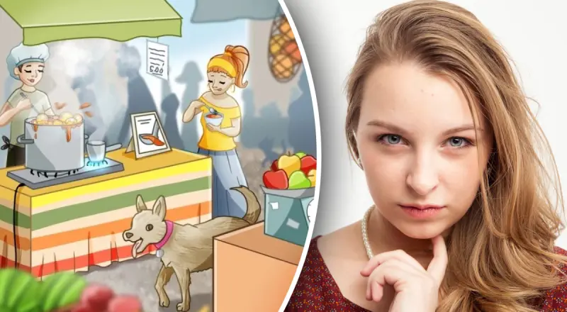 На рисунке мы видим рынок, где за одним из прилавков повар варит в кастрюле суп. Блюдо можно приобрести и сразу на месте съесть, чем и занимается женщина, которую мы видим справа. На прилавке напротив продавец взвешивает яблоки. Между прилавками беззаботно прогуливается собака.