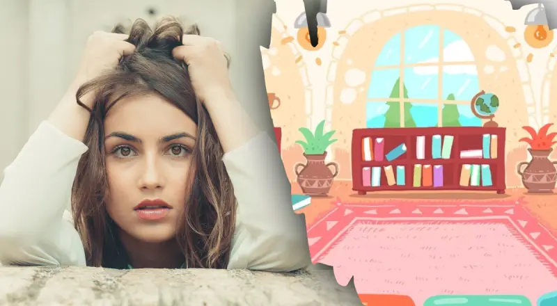 На картинке мы видим комнату с большими окнами, за которыми видны деревья, небо и облака. В помещении в тумбочках стоят книги, а на полу – вазоны в горшках. На полу постелен ковер.