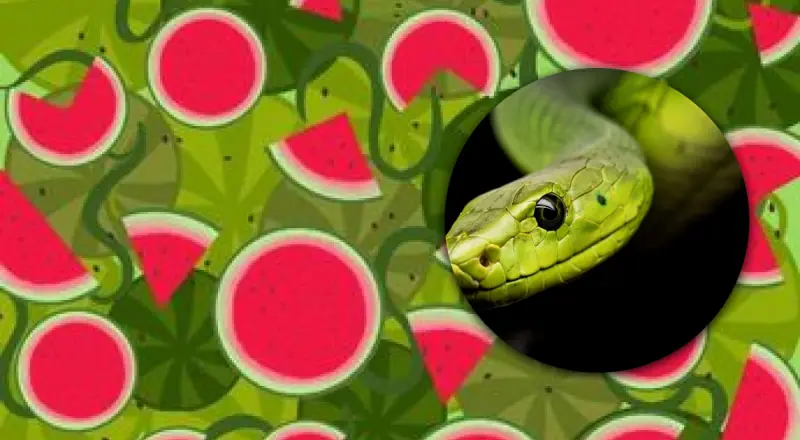 Картинка обманывает зрение, поскольку ломтики арбуза сливаются с целыми фруктами, зелеными линиями и черными семенами. Семена усложняют задачу, поскольку их легко принять за глаза, но есть только одно место, где черные точки встречаются с волнистой линией в таком идеальном положении, чтобы получилась голова змеи.