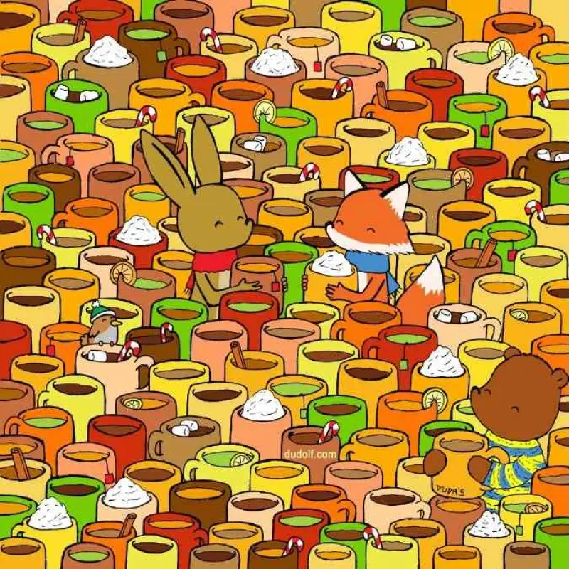Итак, на изображении вы увидите красочную композицию из кофейных кружек, наполненных взбитыми сливками, леденцами и горячими напитками. Однако среди них спрятана одна пустая чашка. Ваша задача найти ее всего за 5 секунд.