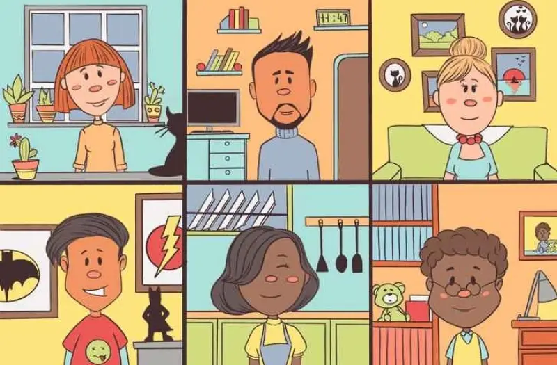На картинке собраны изображения девяти разных людей в их домах. Рядом с этими людьми есть много предметов, а также домашние животные. Нужно догадаться, кто является владельцем собаки и где именно прячется песик.