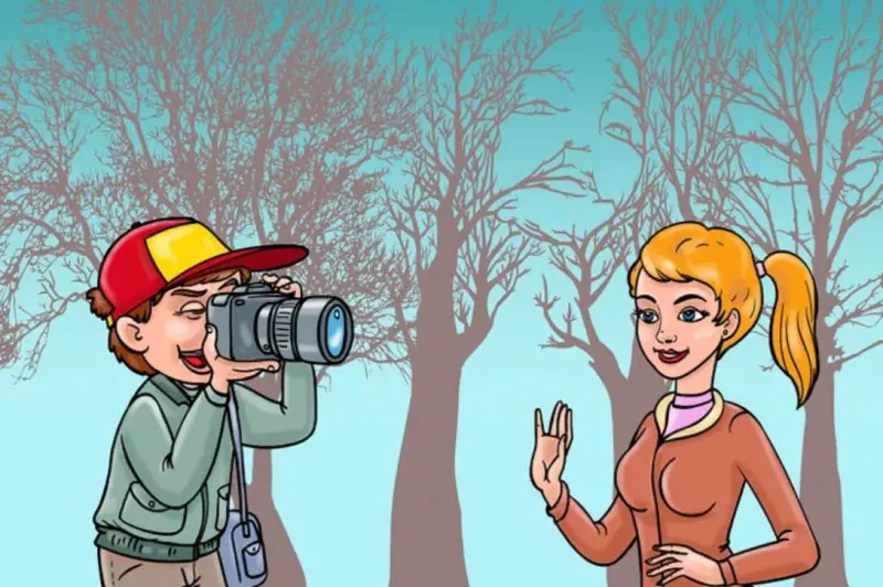 На картинке мы видим парня и девушку, которые прогуливаются в лесу. Во время прогулки парень фотографирует свою спутницу. На первый взгляд кажется, будто никого кроме них в этом месте нет. Но это не так. Если хорошо присмотреться, то станет понятно, что на картинке присутствует еще один человек.