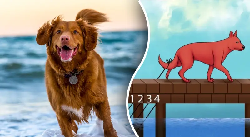В новой оптической иллюзии нужно угадать, какая именно веревка привязана к хвосту собаки, пишет jagranjosh. Мы видим собаку, к хвосту которой привязана веревка, но другой конец веревки не так очевиден. Предлагается четыре варианта, среди которых нужно определить правильный.