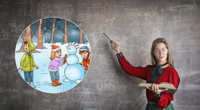 На рисунке изображены трое детей в заснеженном лесу: двое лепят снеговика, а один держит санки. Вокруг них стоят несколько деревьев. Где-то среди этой сцены спрятался олень.