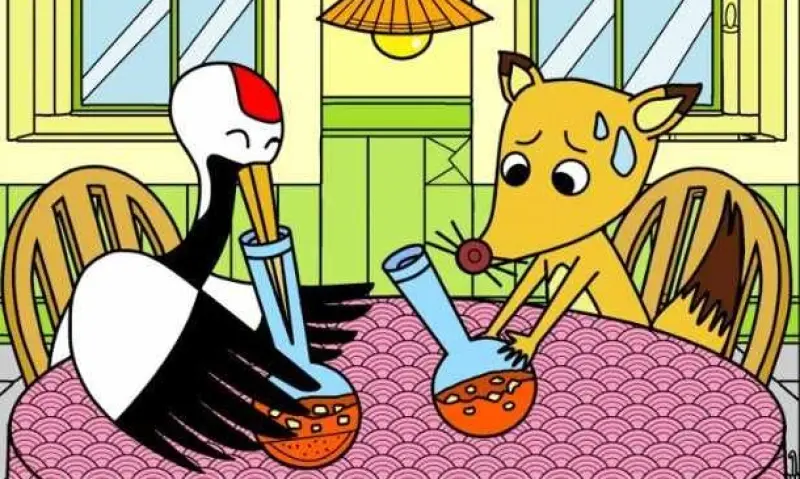 На рисунке мы видим сцену из известной сказки о лисе и журавле. В то время, как журавлик радостно потребляет пищу из узкой колбы, лиса лишь завистливо заглядывает в емкость, из которой никак не может достать вкусную пищу.