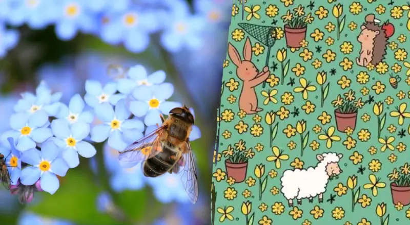 Итак, а теперь взгляните на изображение ниже. На картинке - множество ярко-желтых цветов, а также кролик с сачком для бабочек, ягненок, который ест траву, и ежик.