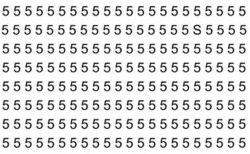 На картинке – таблица, где большое количество цифр 5. Среди них нужно найти букву S. Когда цифр очень много, визуально S может быть похожа на 5, поэтому ее и сложной найти.