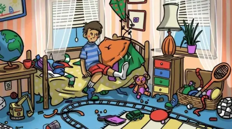 На картинке – парень в комнате, где много разных вещей. Он ищет, куда же делся ботинок. Наша задача – найти ботинок.