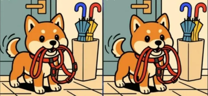 Показано две картинки. На обоих – собачка, которая держит в зубах поводок, и, похоже, ждет хозяина, чтобы отправиться гулять. Наша задача – найти три отличия второй картинки от первой.