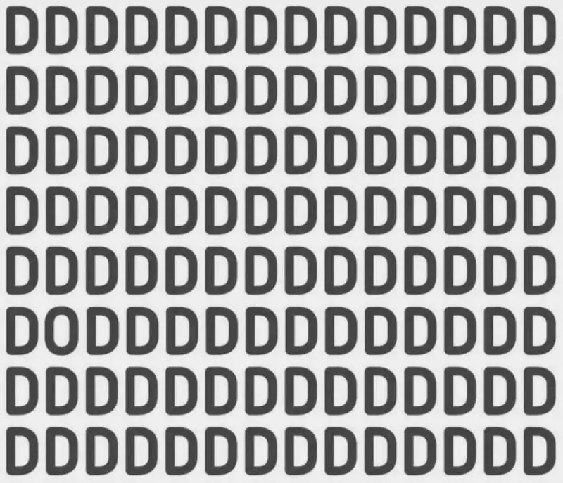 На картинке – серая таблица, где множество английских букв D. Ваша задача – найти букву O, которая тоже здесь где-то спрятана.