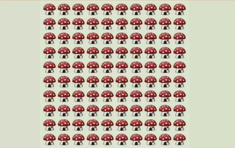 На картинке изображена сетка, полная разноцветных грибов. На первый взгляд все они кажутся совершенно одинаковыми. Однако это не так. Есть один гриб, который отличается от остальных. Сможете ли вы найти его за 7 секунд?