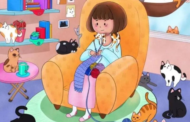 Женщина спокойно сидит в своем кресле и вяжет свитер. Ее окружают домашние кошки. Но в этой комнате спрятана одна собака. Все видят кошек, кроме собаки.