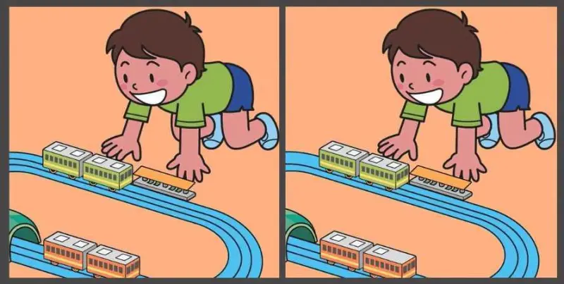 В этой задаче "Найди отличия" представлены две одинаковые картинки с мальчиком, играющим с игрушечным поездом. Хотя на первый взгляд эти две картинки кажутся идентичными, но это не так. Между двумя картинками есть три отличия.