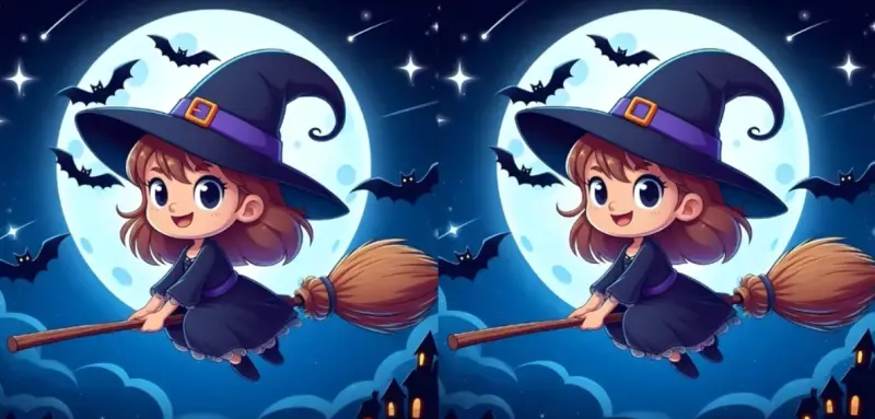 Итак, вы готовы к следующему испытанию? Внимательно посмотрите на два изображения юной ведьмы, летящей на метле. На первый взгляд, обе картинки кажутся идентичными. Но на самом деле между ними есть два отличия, и ваша задача - найти их за 11 секунд. Попробуйте эту головоломку и проверьте, насколько остро у вас зрение!