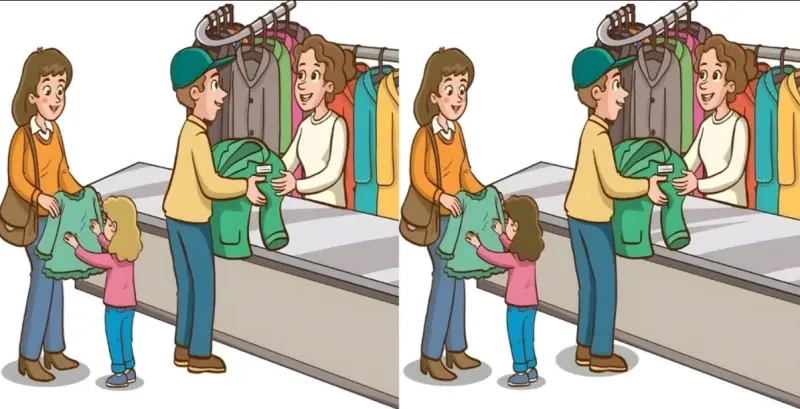 Готовы к следующему испытанию? Взгляните на две картинки магазина одежды, где семья покупает одежду. На первый взгляд картинки кажутся одинаковыми, но присмотритесь внимательнее. На них скрываются 3 крошечных отличия. Думаете, сможете найти их все всего за 25 секунд? Давайте проверим, насколько вы зорки!