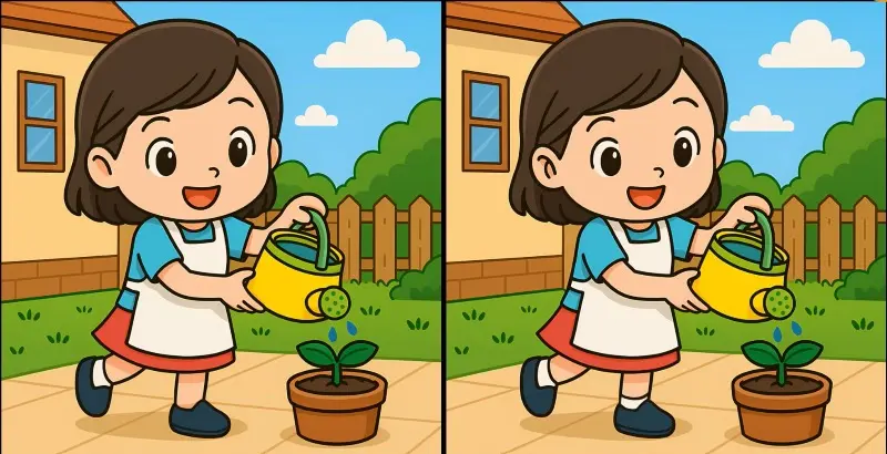 Итак, вы готовы к следующему заданию? Внимательно посмотрите на два изображения девочки, поливающей растение. На первый взгляд они могут показаться одинаковыми, но на них скрываются 3 небольших отличия. Думаете, сможете найти их все за 59 секунд? Попробуйте и проверьте свою остроту зрения!