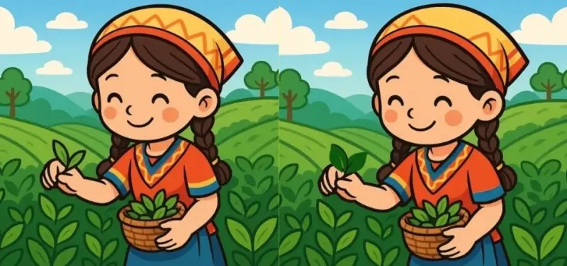 На картинке изображена девочка, собирающая чайные листья на плантации. На первый взгляд, эти две картинки выглядят одинаково. Однако между ними есть три отличия, и вам нужно найти их в течение 15 секунд.