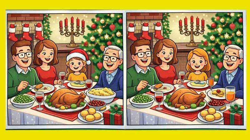 Итак, вы готовы к следующему заданию? Внимательно посмотрите на два изображения рождественнского семейного ужина. На первый взгляд они могут показаться одинаковыми, но на них скрываются 3 небольших отличия. Думаете, сможете найти их все за 16 секунд? Попробуйте и проверьте свою остроту зрения!