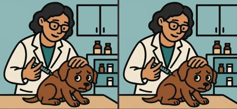 Итак, вы готовы к следующему заданию? Внимательно посмотрите на два изображения ветеринара, делающего укол собаке. На первый взгляд картинки могут показаться одинаковыми, но на них скрываются 3 небольших отличия. Думаете, сможете найти их все за 63 секунды? Попробуйте и проверьте свою остроту зрения!