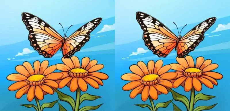 На двух картинках, которые кажутся абсолютно идентичными, мы видим бабочек, летающих над цветами. На первый взгляд может казаться, будто бы обе бабочки одинаковые, но это не так - между ними есть некоторые различия. И именно их нужно отыскать.
