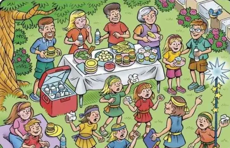 На картинке мы видим интересную сцену – большая семья собралась на пикник и весело проводит время на свежем воздухе. Взрослые выкладывают на стол еду, в то время как дети играют в различные веселые игры.