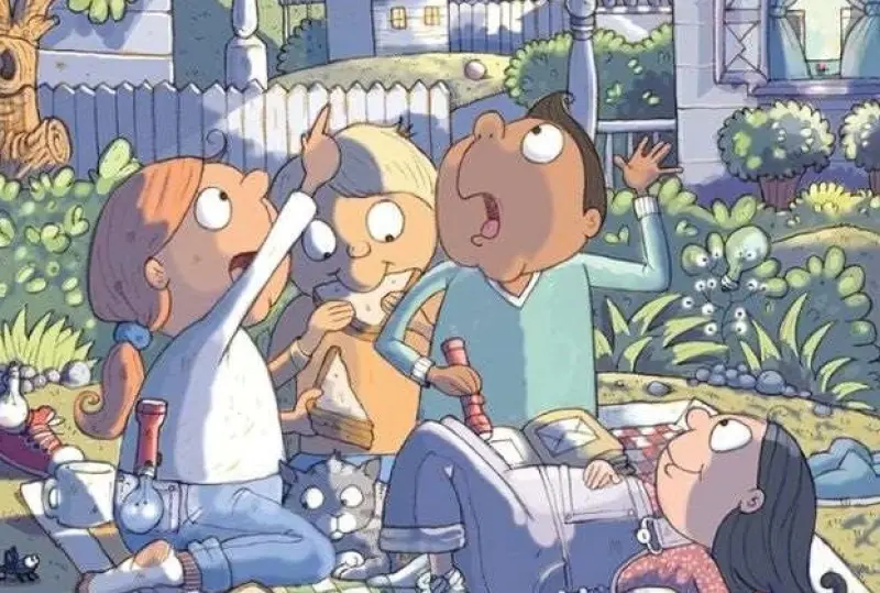 На картинке мы видим семью, которая устроила пикник под звездным небом. Вместе с семьей приятными посиделками наслаждается и котик. Дети и взрослые с интересом рассматривают звезды на небе, едят бутерброды и общаются.