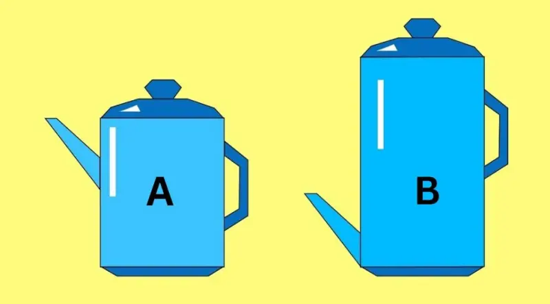 На картинке мы видим два чайника голубого цвета, которые обозначены буквами А и В. Нужно внимательно присмотреться к ним и ответить на вопрос, в каком чайнике поместилось больше жидкости.