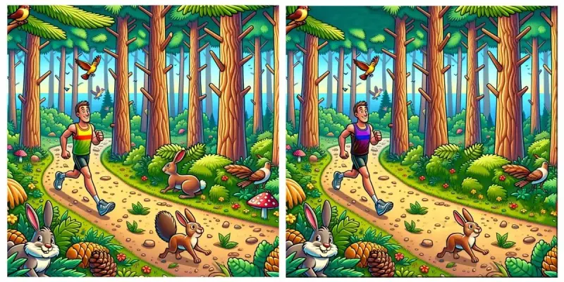 А теперь внимательно посмотрите на картинку, на которой изображен бегун в лесу. Необходимо найти пять отличий между двумя похожими изображениями.