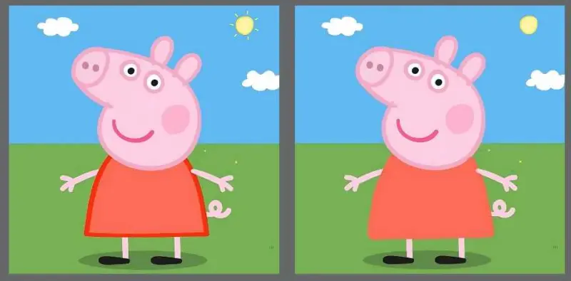 В сегодняшней головоломке представлены две одинаковые картинки свинки Пеппы. Хотя на первый взгляд они кажутся идентичными, но это не так. Между двумя картинками есть два отличия.