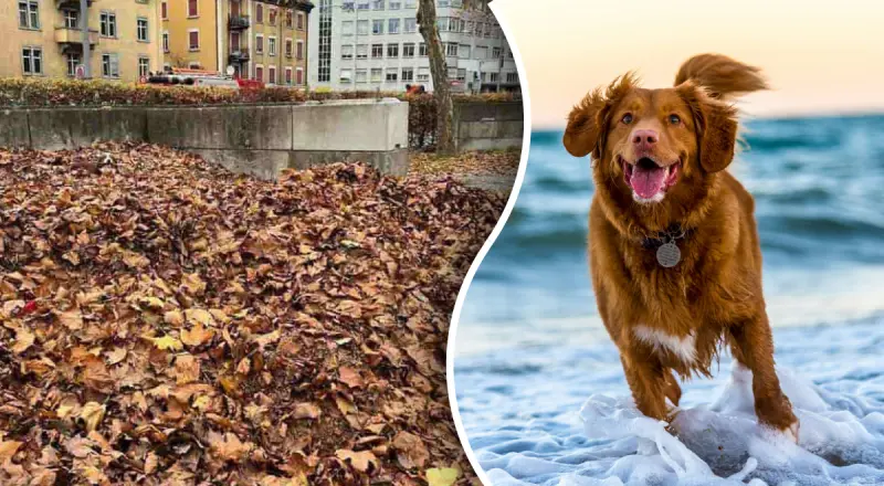 На картинке мы видим кучу сухих осенних листьев в городском парке. На первый взгляд может казаться, будто бы никакой собаки не картинке нет, но на самом деле это не так - она точно где-то там есть, но очень хорошо спрятана.