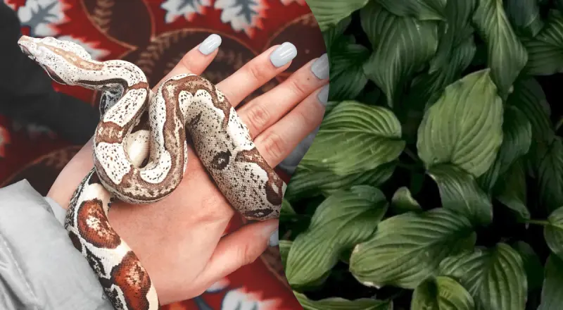 Мы видим на фотографии много листьев растения с названием хоста, которое часто используется в качестве декоративного в садоводстве и ландшафтном дизайне. На первый взгляд кажется, что кроме листьев на картинке больше ничего нет. Но это не так – там спряталась змея, которая старается быть незаметной. Хватит ли вам внимательности и терпения, чтобы найти ее?