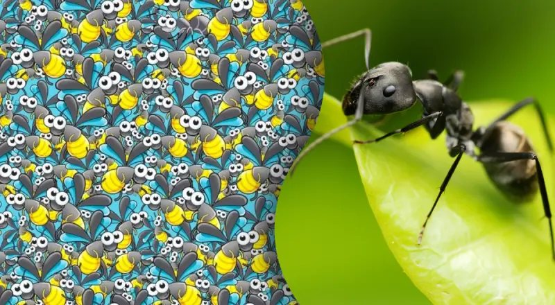 Если вам не удается быстро найти муравья среди пчел, даем небольшую подсказку – обратите внимание на верхний край рисунка ближе к центру.