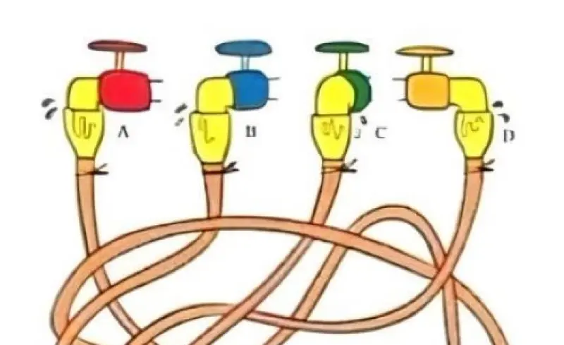 На картинке мы видим четыре трубы, которые прикреплены к кранам. С каждой из них течет вода, но только с одной жидкость попадает точно в ведро, наполняя его.