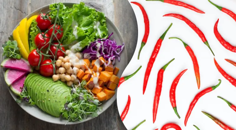 На фото изображена полная тарелка, на которой мы видим порезанные на кусочки и целые овощи, зелень, а также бобовые. Но такая сытная тарелочка скрывает в себе один "сюрприз" – где-то там спрятался перец чили, заметить который почти невозможно.