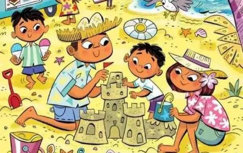 На картинке мы видим интересный сюжет - папа, мама и их дети отдыхают на пляже и строят замок из песка. Двое детей - мальчик и девочка - побежали за мороженым.