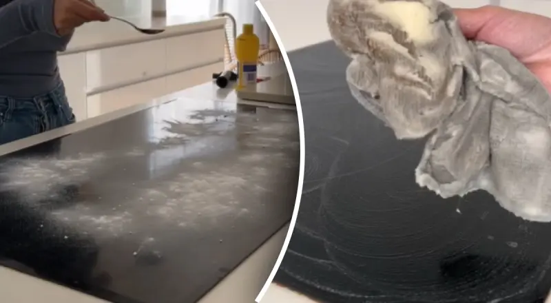 Мама двоих детей показала, как использует классическую комбинацию пищевой соды и лимонного сока, чтобы очистить стеклянную плиту.
