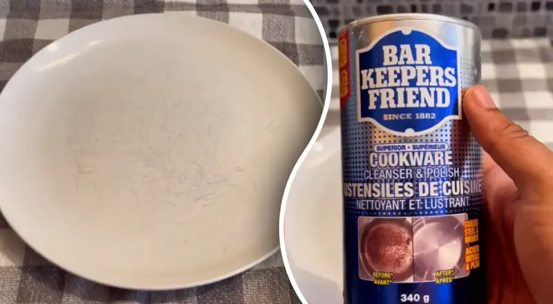 Джоэль, автор лайфхака в TikTok в ролике показал белые обеденные тарелки, обильно покрытые царапинами. Он говорит, что в течение многих лет он думал, что царапины - это покрытие, которое он соскреб с тарелки, но недавно узнал, что это не так. На самом деле это металлические разводы, оставленными ножами и другими столовыми приборами, но их можно буквально стереть.