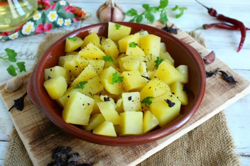 Готовність можна перевірити за допомогою веделки — вона повинна легко входити і виходити з картоплини.