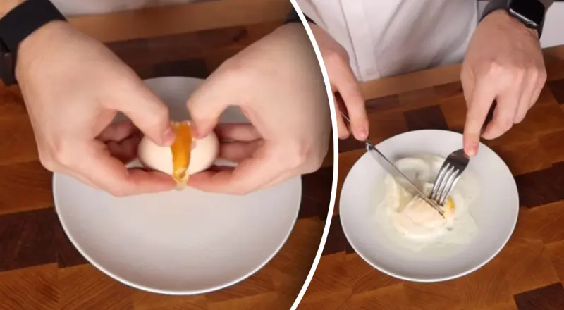 Повар смазал тарелку маслом и выложил на нее разбитое яйцо. Далее он накрыл ее еще одной тарелкой так, чтобы ее края плотно прилегали к посуде, на которой лежит яйцо.