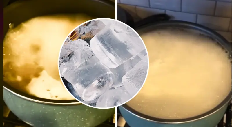 В клипе, когда вода начинает закипать, мужчина бросает в кастрюлю кубик льда, и он мгновенно понижает температуру - предотвращая переливание через край.