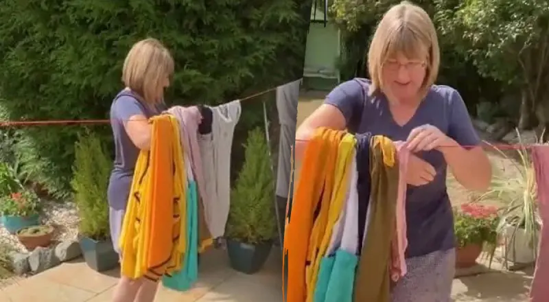 А суть лайфхака состоит в том, что женщина берет бельевую веревку - ту, что тянется от одного конца сада до другого, и продевает кучу белья через линию по мере ее натяжения. Затем она возвращается на другой конец, перетаскивая за собой белье на шнуре, и за считанные секунды развешивает одежду без лишних хлопот.