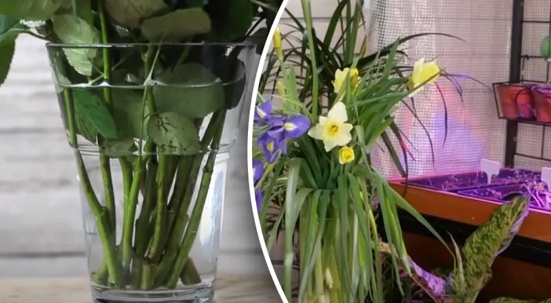 Сделайте косой срез на 2 сантиметра при помощи острого ножа или ножниц, предварительно погружая стебли в воду.