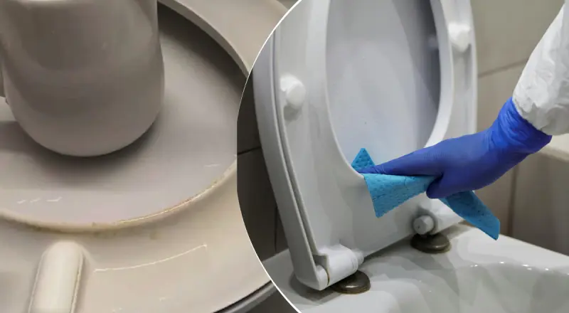 Часто можно увидеть, что желтые пятна появляются даже с внутренней части сидушки. В таком случае, чтобы без усилий растворить мочевой камень, вам нужно немного подвернуть ткань, чтобы она доставала и к этой части пластика.